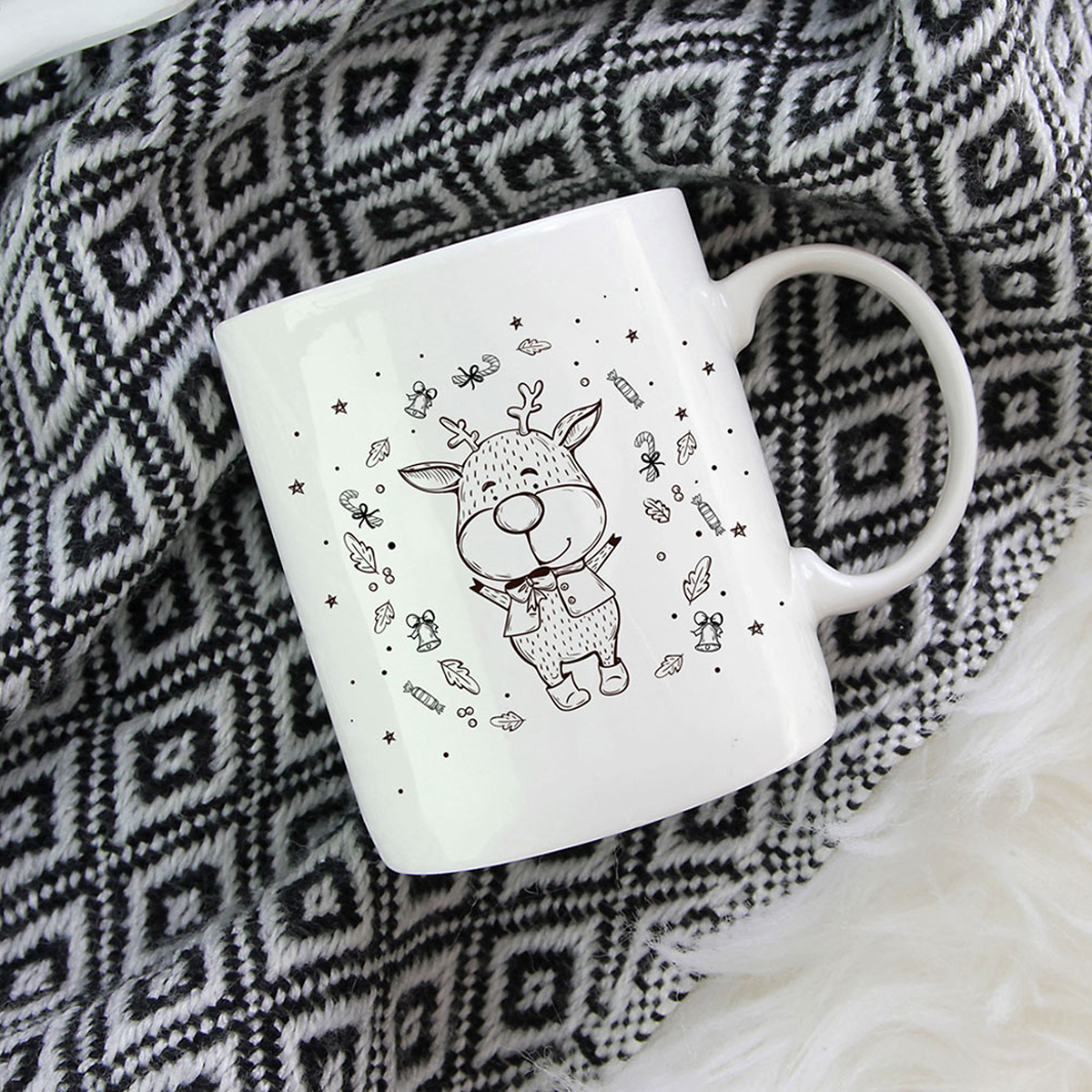 Biely kramický hrnček potlačený jednoduchým vianočným motívom.