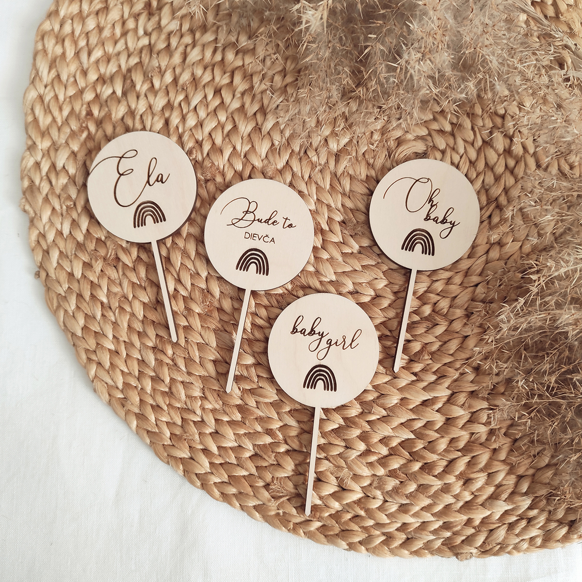 Set 4ks drevených mini zápichov do koláčikov na Baby shower party - oslavu príchodu dieťatka na svet. Set obsahuje 4 druhy vygravírovaných textov - 1x zápich s menom, 1x zápich s pohlavím, 1x zápich Oh baby, 1x zápich baby girl/baby boy. Zápichy sú vyrobené z kvalitnej preglejky hrúbky 4mm s prírodným hladkým povrchom.