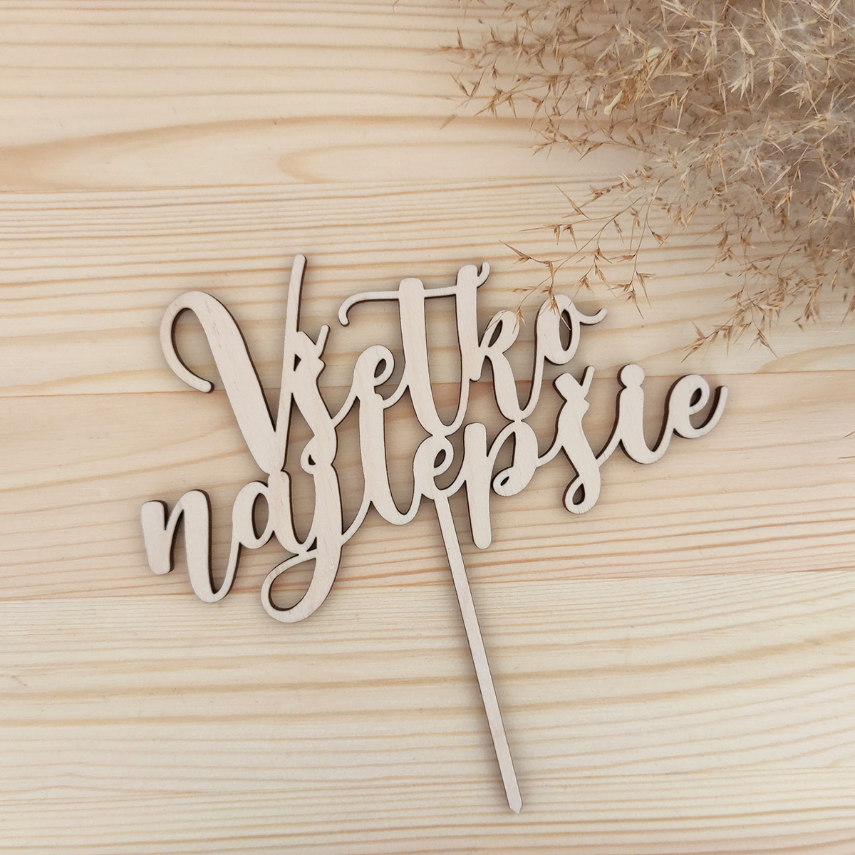 Drevený zápich na tortu Všetko najlepšie môžte využiť na tortu a koláče alebo ako dekoráciu k oslave narodenín. Zápich je vyrobený z kvalitnej preglejky hrúbky 4mm.