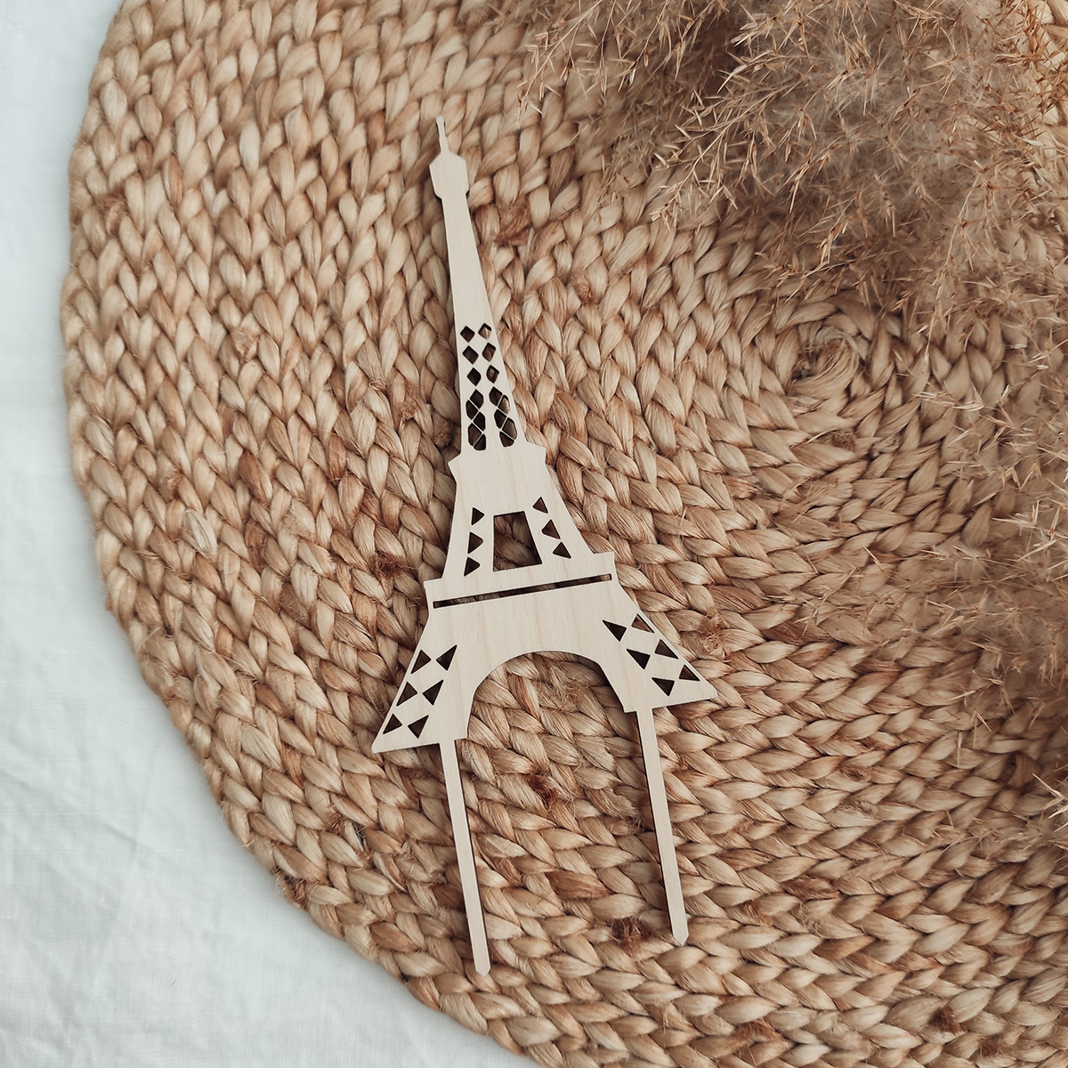 Drevený zápich na tortu v tvare Eiffelovky skvelo doplní tématickú narodeninovú alebo svadobnú tortu alebo koláč. Ideálny na tortu pre milovníka Paríža. Zápich je vyrobený z kvalitnej preglejky hrúbky 4mm.