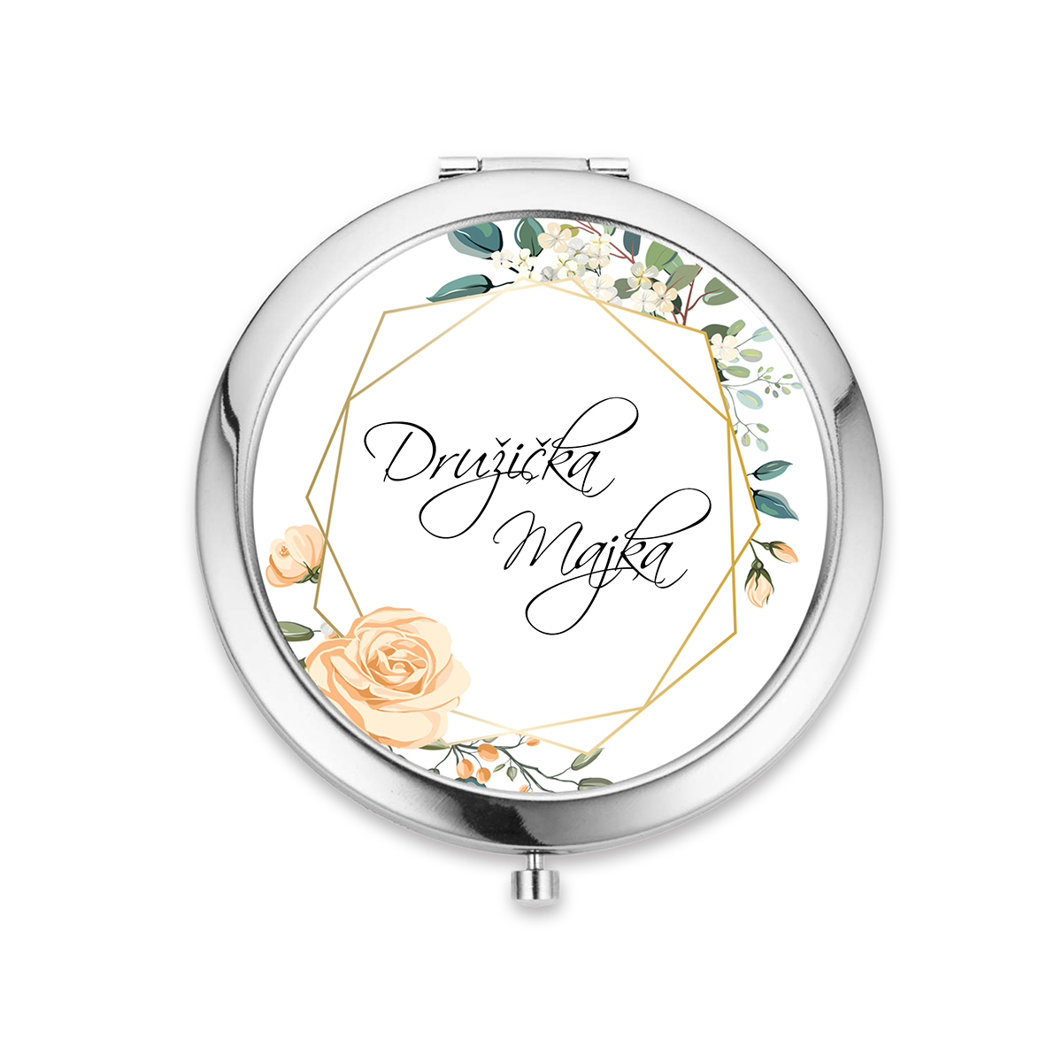 Kvalitné zrkadielko do kabelky s jednoduchým otváraním pomocou stlačenia. Zrkadielko je milým aj praktickým darčekom na rôzne príležitosti - napr. pre družičky, nevestu, svedkyňu, svadobné mamy, kamarátky, maminku, sestru a pod. Vo vnútri sú dve zrkadielka. Zrkadielko je z bižutérneho kovu bez obsahu niklu, olova a kadmia a grafický obrázok je pod vrstvou živice. Obrázok má priemer 57mm.